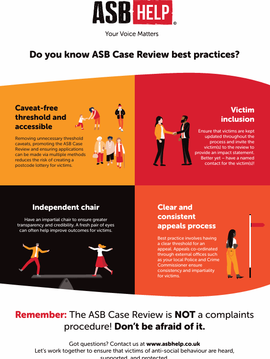 Using ASB Help as an independent chair can build trust and confidence in the ASB Case Review process, for both victims and practitioners, while ensuring that lessons are genuinely learned and acted upon.